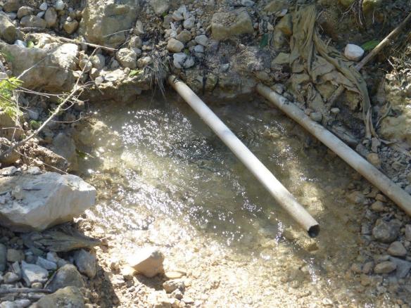Church members seen here are trying to find the end of the pipe near the spring to reconnect it.