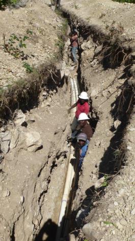 At this writing, we are moving well on the pipe laying and rock removal; much faster than thought possible thanks to overwhelming community participation. All the pipe ODRINO had available has been used and we are waiting for a boat from Florida with the next shipment of pipe. After many delays it has gotten approval to sail. We are also waiting for the roofing tin for roofs damaged in the hurricane winds.