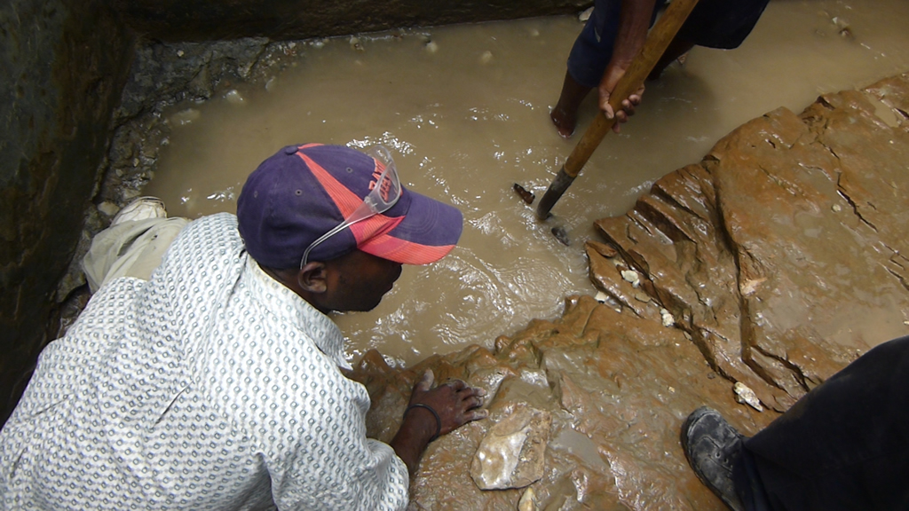 ODRINO technicians along with the community under the leadership of the pastor of one church and the lay leader of the other excavated the spring to see if there was still any water available. They had to break out part of what was left of the front wall of the old spring cap ruins and then dig out more than four feet of sand, gravel, slime and mud. After two weeks, water bubbled up in the sand at one end of the enclosed area and they halted operations to wait for the project engineer. He requested the men dig a little deeper just to see. Within a few minutes they uncovered the exact spot where the water source was and it strongly gushed up out of a crack in the rock.